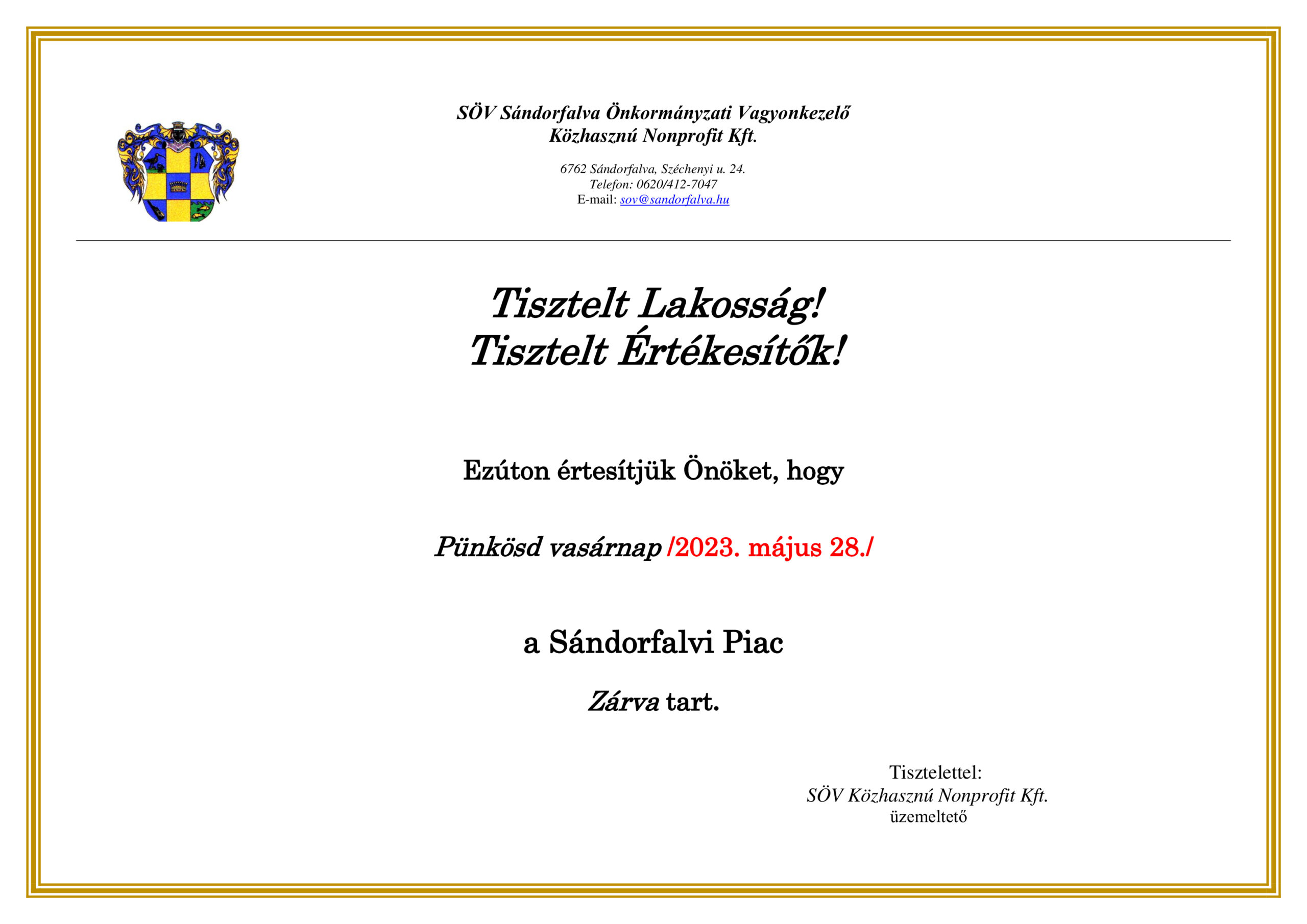 Jegyzőkönyv Sándorfalva Városi Önkormányzat Képviselő-testületének 2023. április 27-én megtartott soros, nyílt üléséről2023-05-09Pünkösd vasárnap a piac zárva tart2023-05-09 Vissza a hírekhez Utoljára frissítve 2023-05-09 44-53/2023.(IV.27.) Kt. határozat Sándorfalva Városi Önkormányzat Képviselő-testületének 2023. április 27-én megtartott soros, nyílt ülésének jegyzőkönyvéből Share on FacebookTweet