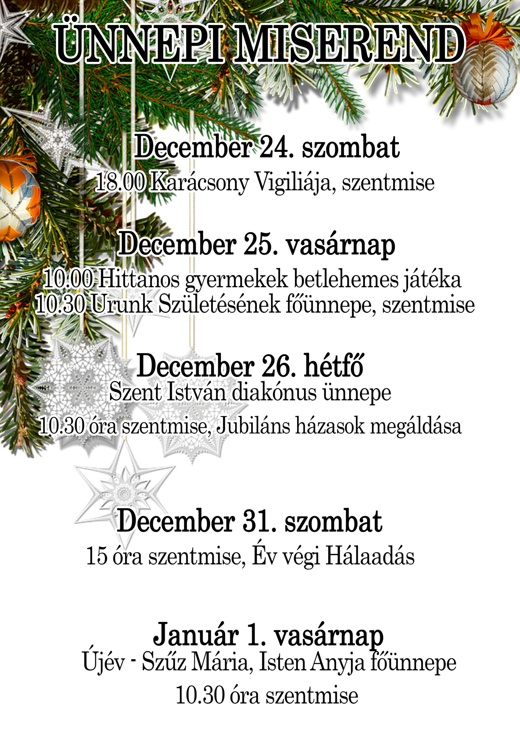 2022-es ünnepi miserend2022-12-13Karácsonyi koncert december 19-én2022-12-14 Vissza a hírekhez Utoljára frissítve 2022-12-13 Share on FacebookTweet