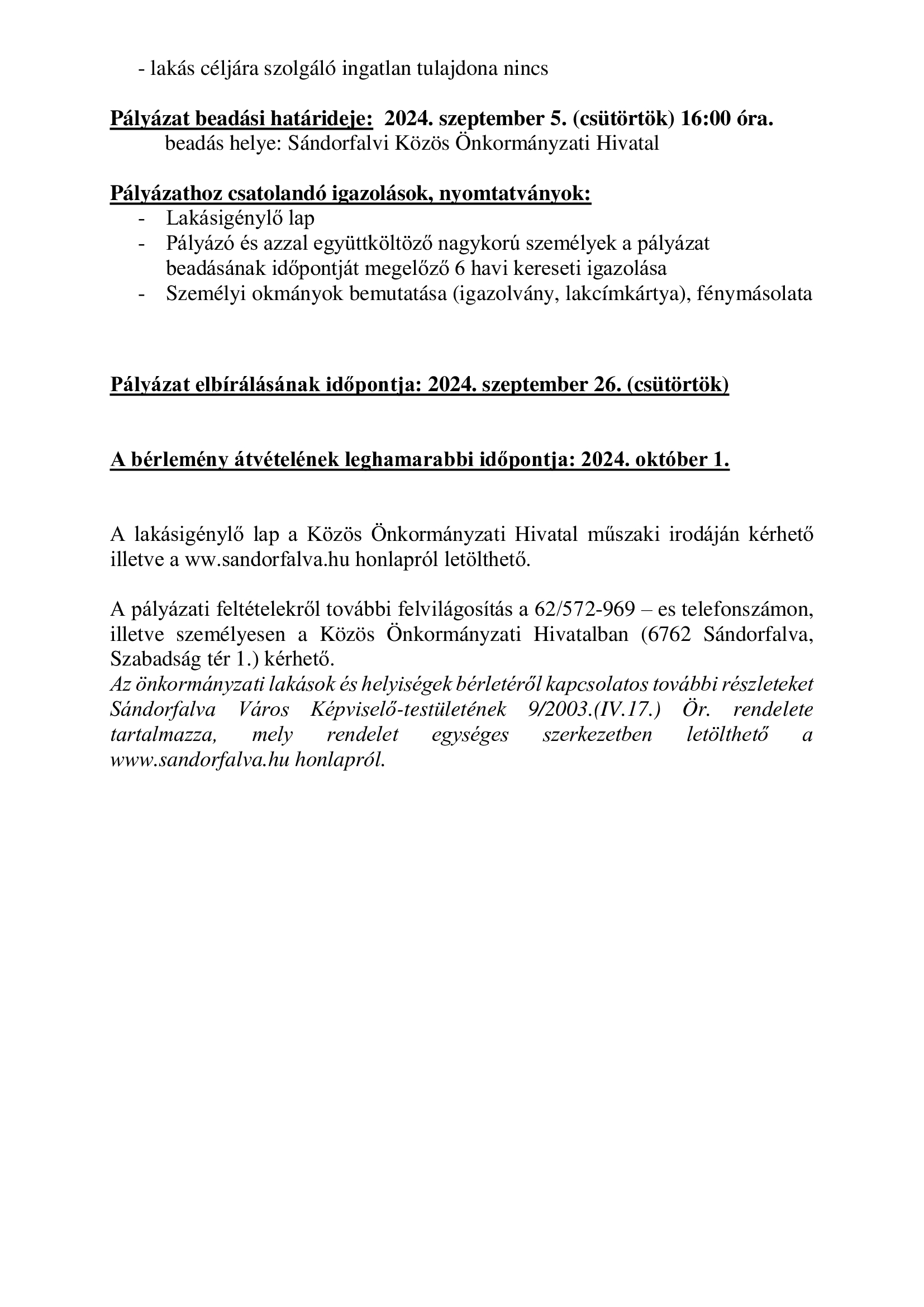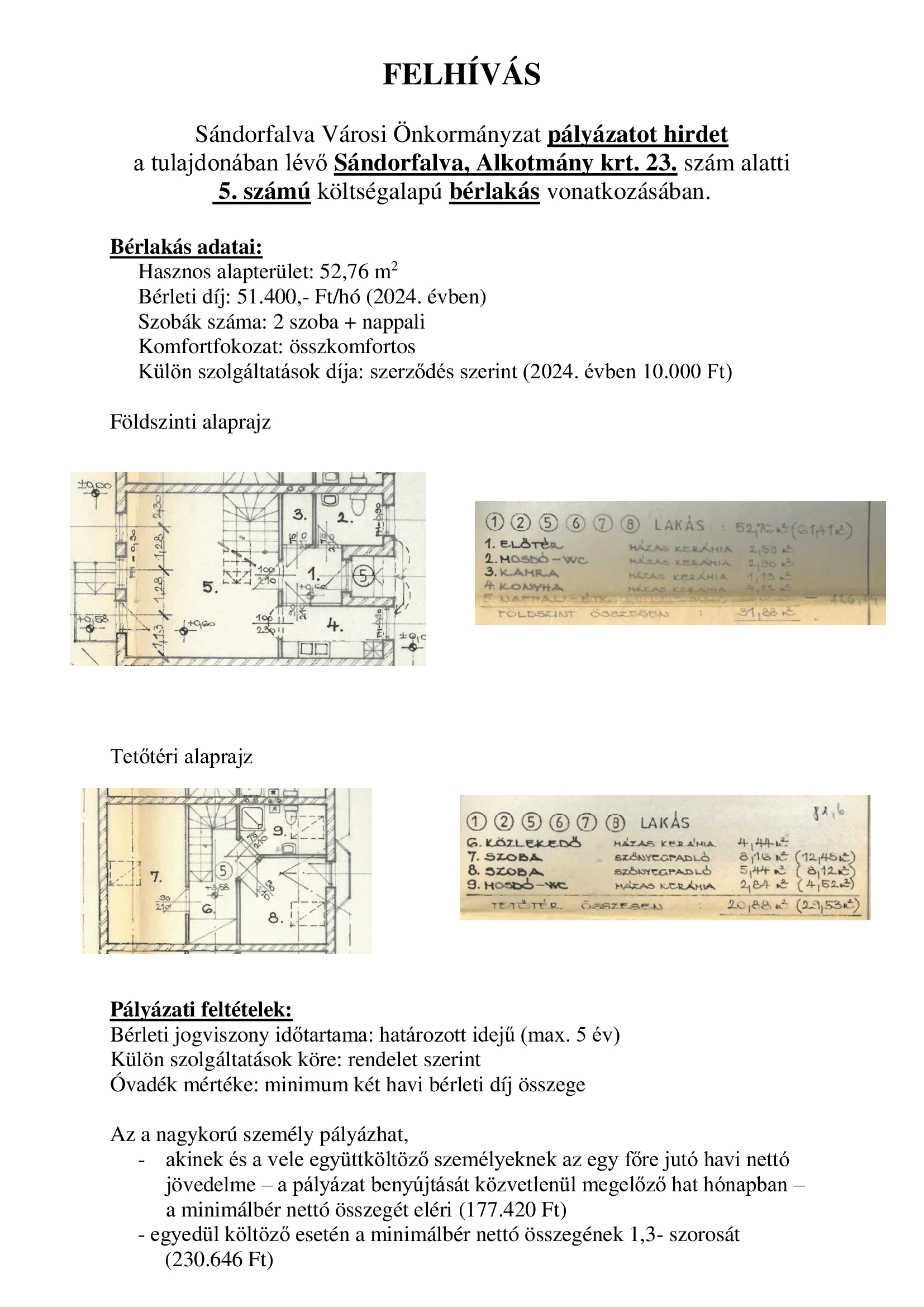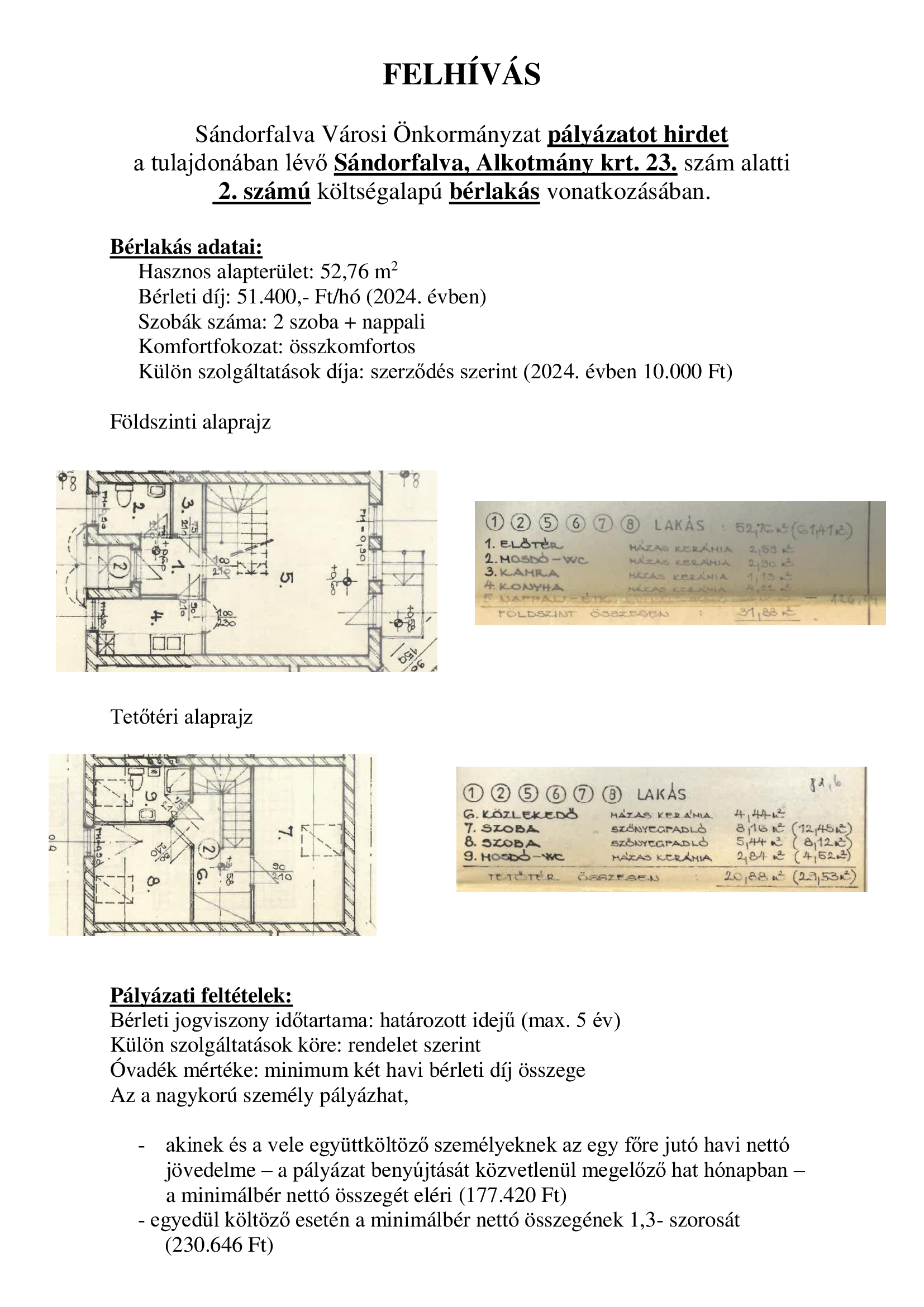 A Sándorfalva Városi Önkormányzat pályázatot hirdet a tulajdonában lévő 2 darab költségalapú bérlakás vonatkozásában. A felhívások részleteit alább tekinthetik meg és tölthetik le.
