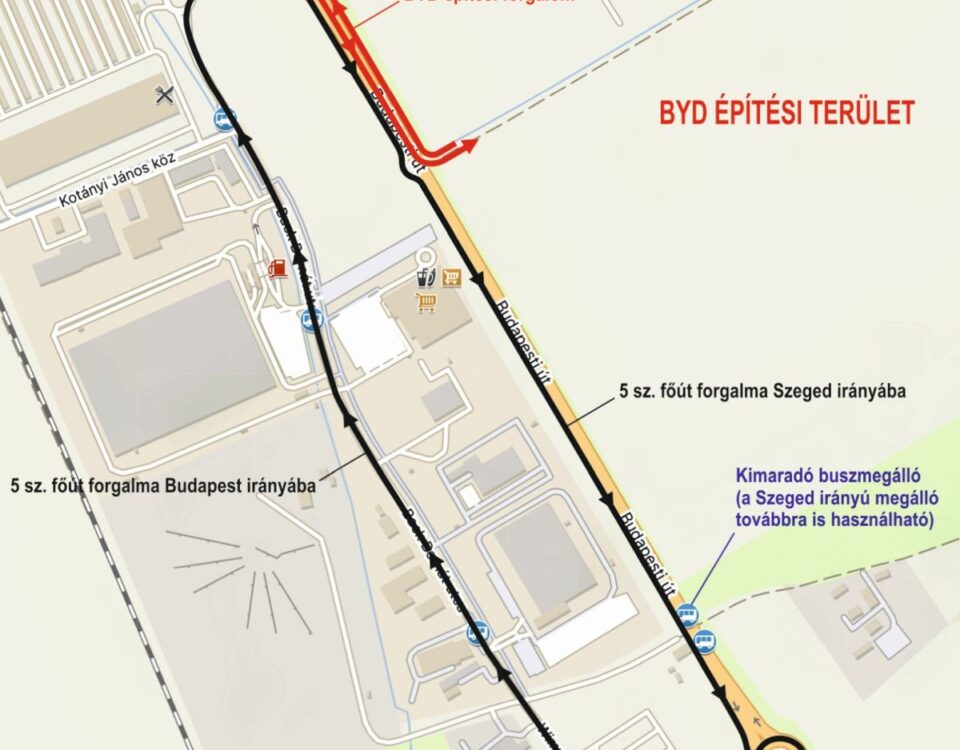 A BYD-építkezés miatt november végéig egyirányú lesz az 5-ös út a Back Bernát utcai körforgalmak között.