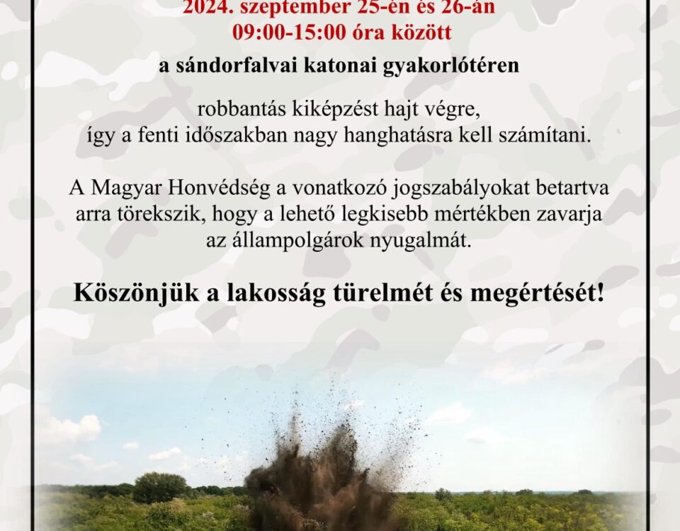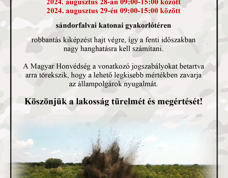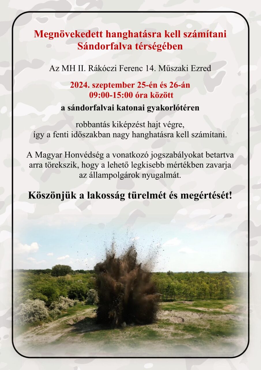 Az MH II. Rákóczi Ferenc 14. Műszaki Ezred állománya 2024. augusztus 28-29.-én, 09:00-15:00 közötti időszakban a sándorfalvai katonai gyakorlótéren robbantás kiképzést hajt végre, így a fenti időszakban nagyobb hanghatásra kell számítani.