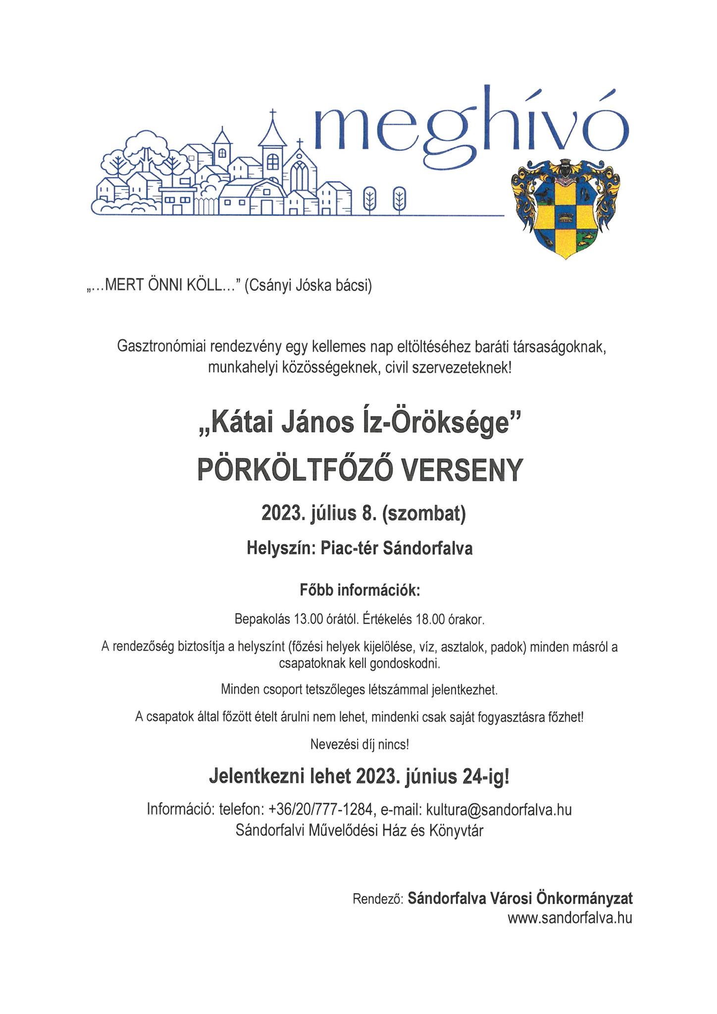 Idén is lesz pörköltfőző verseny a Városnapon2023-06-122023. június 7.2023-06-13 Vissza a hírekhez Utoljára frissítve 2023-06-13 Jegyzőkönyv Sándorfalva Városi Önkormányzat Képviselő-testületének 2023. június 7-én megtartott rendkívüli, nyílt üléséről Share on FacebookTweet