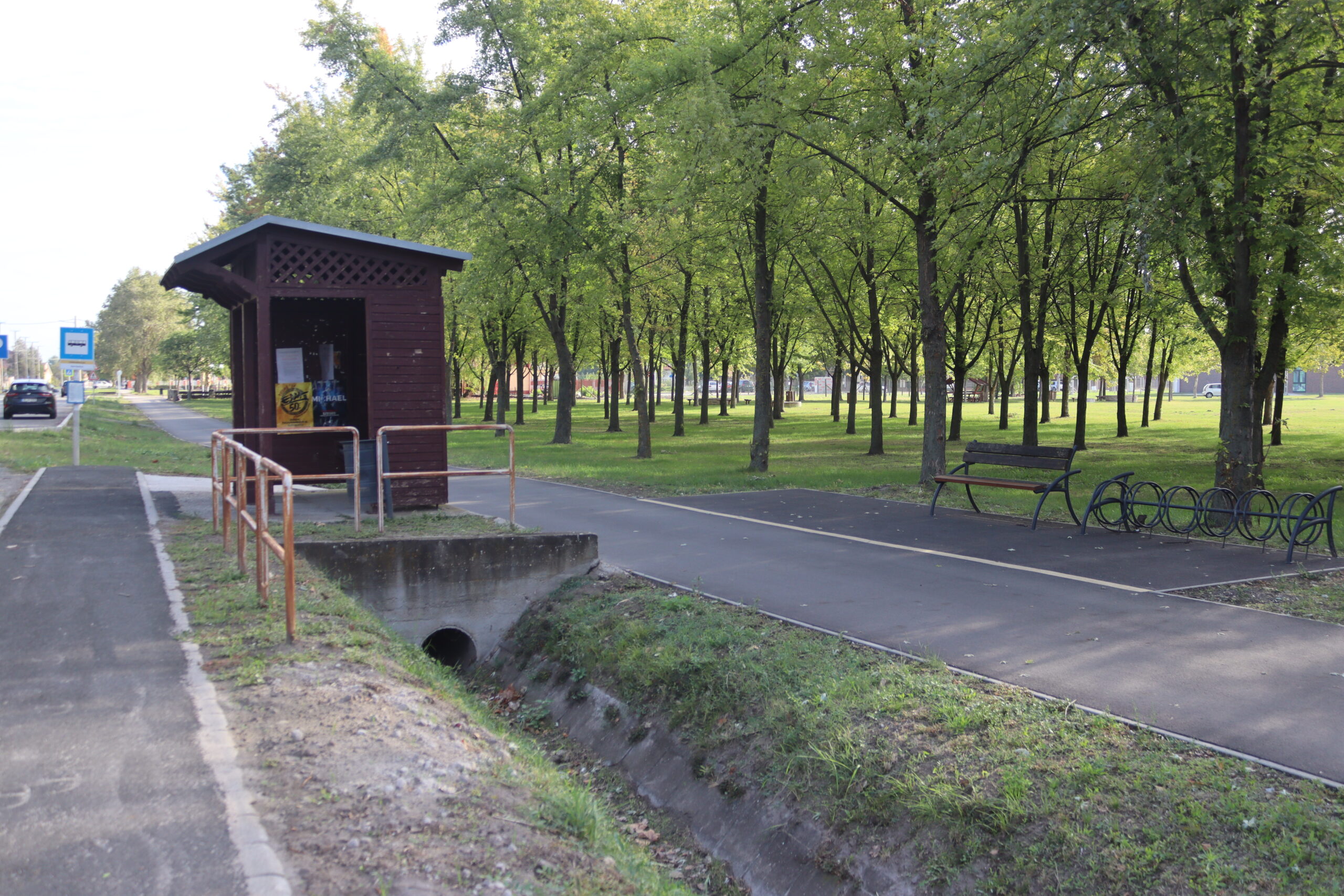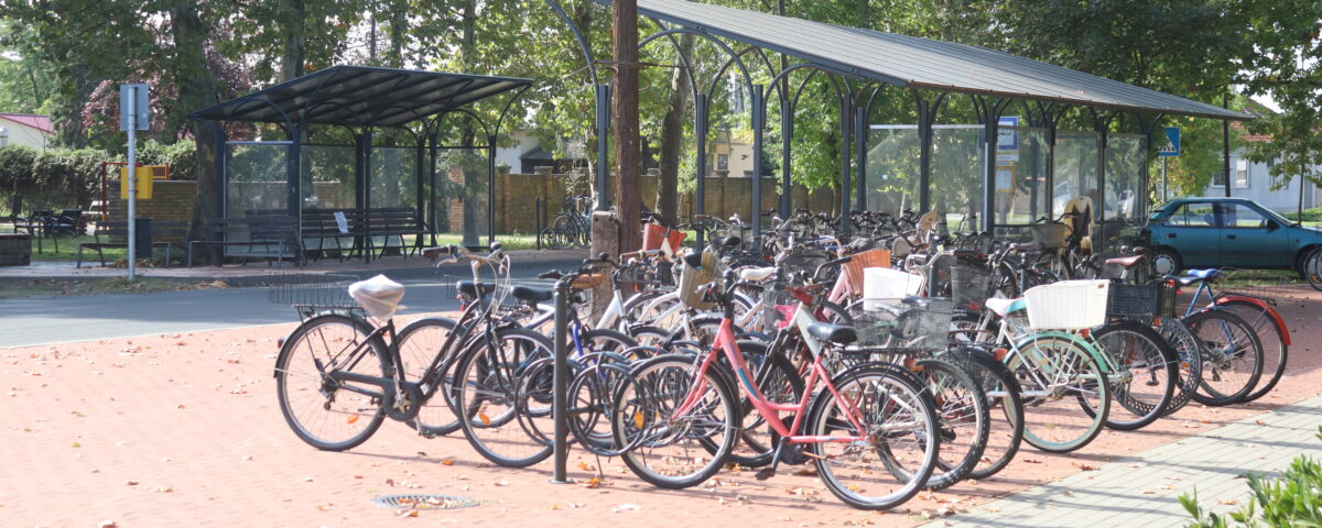 A városközpontban, a templomkerti buszmegállóban fedett kerékpártároló is található, így esős időben sem lehet probléma a váltott közlekedési eszközű utazás.