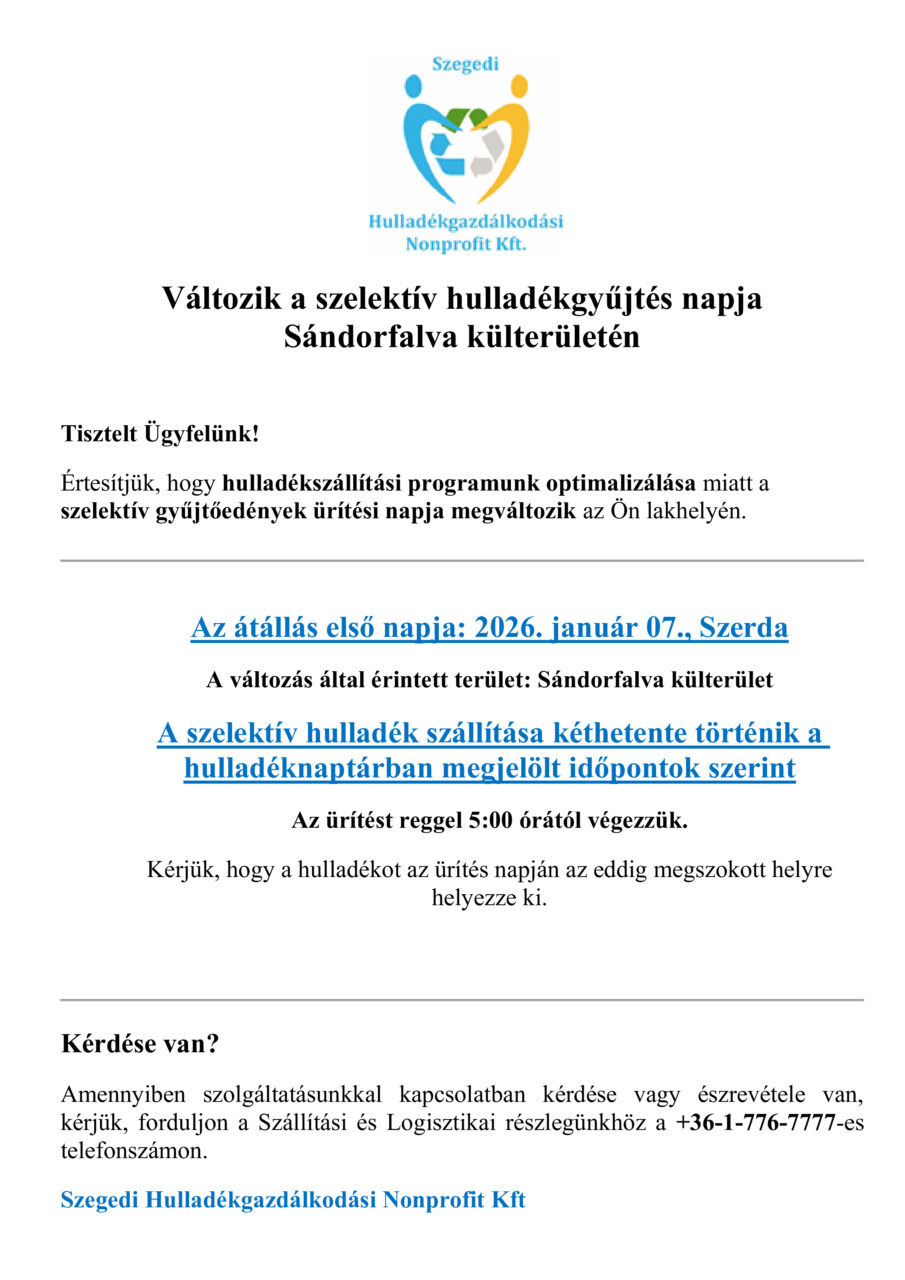Külterületi lakosok figyelem! Változik a szelektív hulladékgyűjtés napja