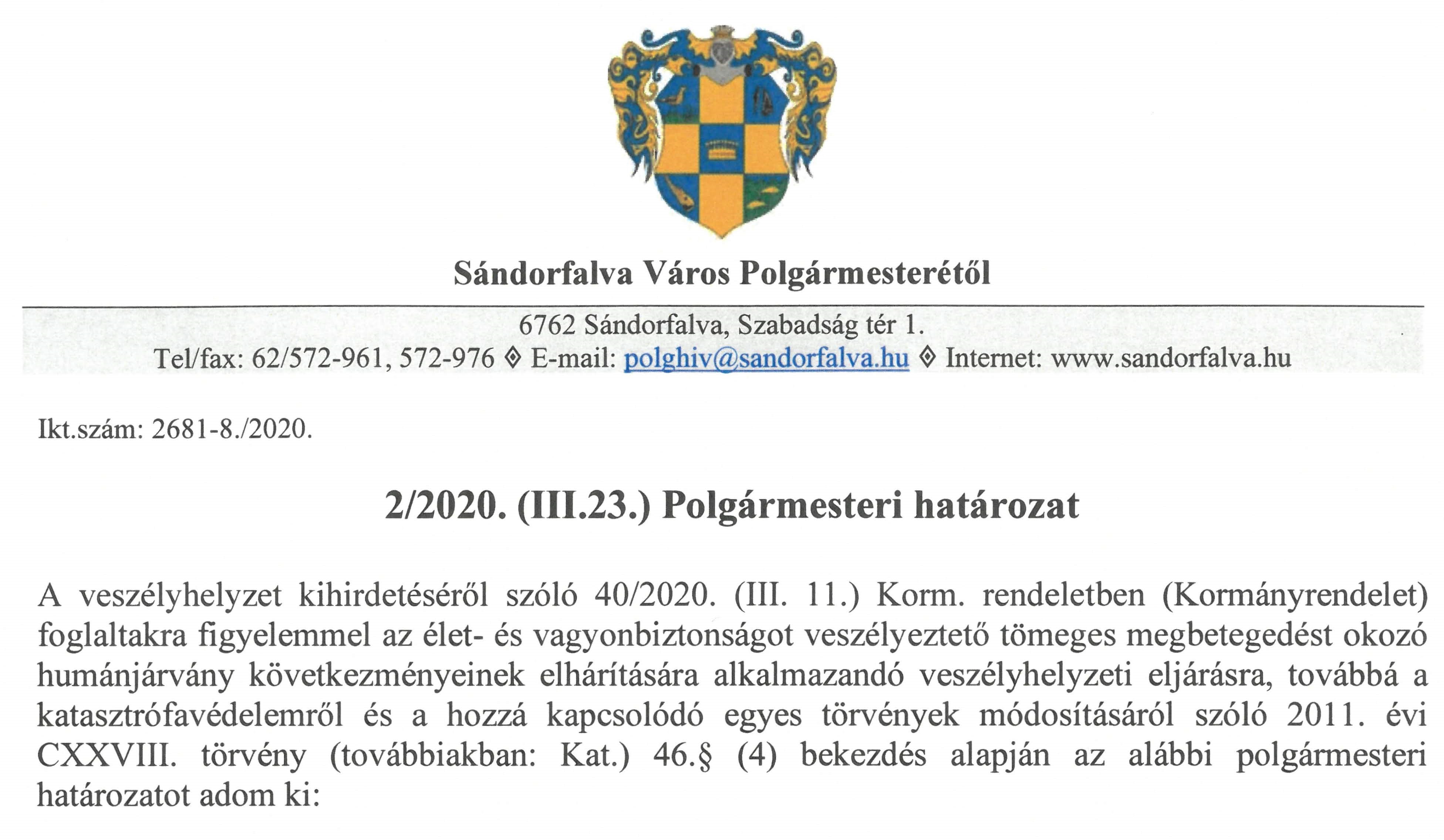 Polgármesteri határozat a veszélyhelyzet kapcsán