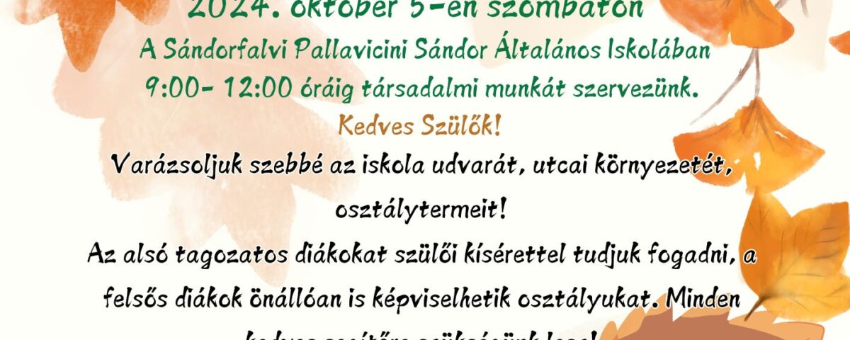 A Sándorfalvi Általános Iskolás Gyermekekért Közalapítvány és a Sándorfalvi Pallavicini Sándor Általános Iskola 2024. október 5-én szombaton önkéntes munkát -ÖKO rendezvényt szervez az általános iskolában és az iskolát körülvevő utcai szakaszokon. Minden Önkéntest szeretettel várnak.