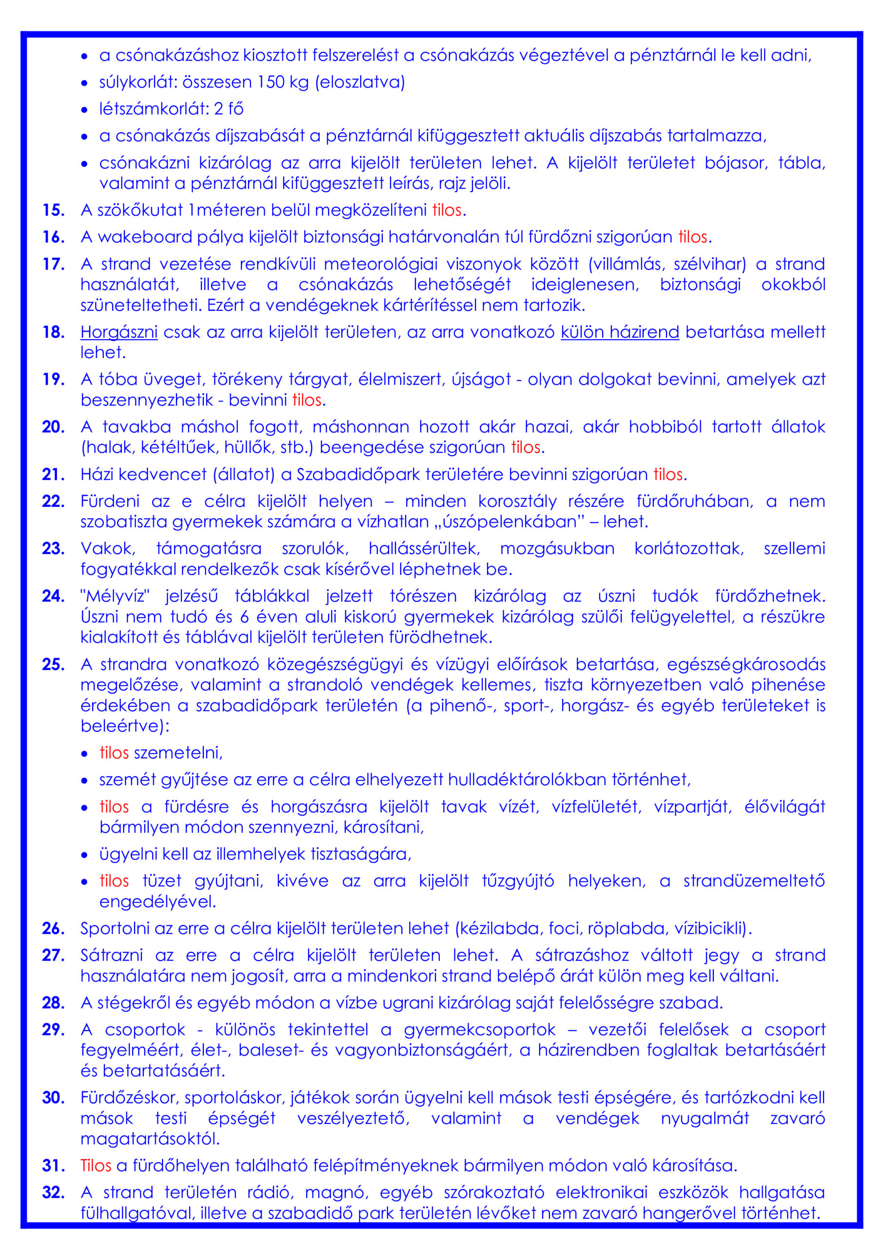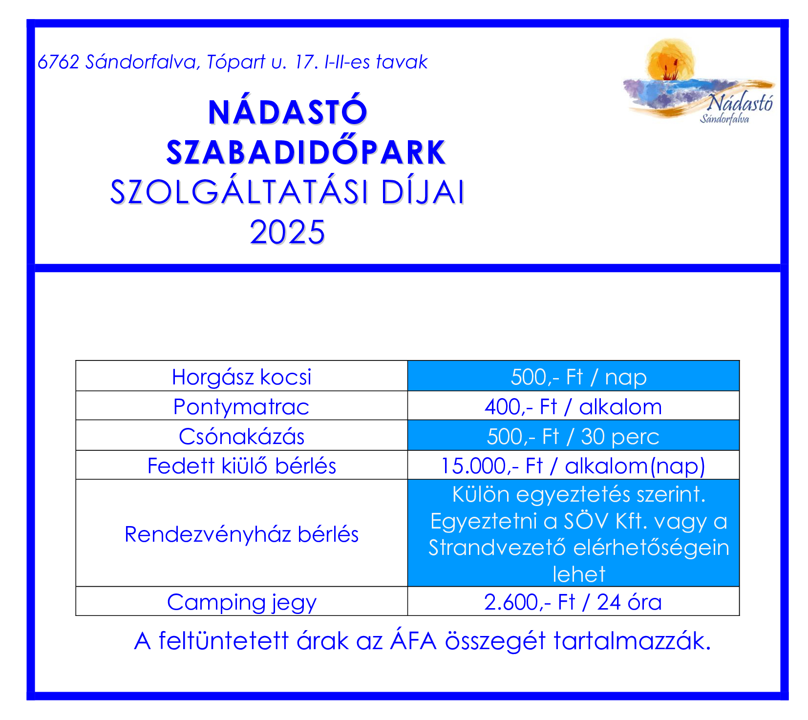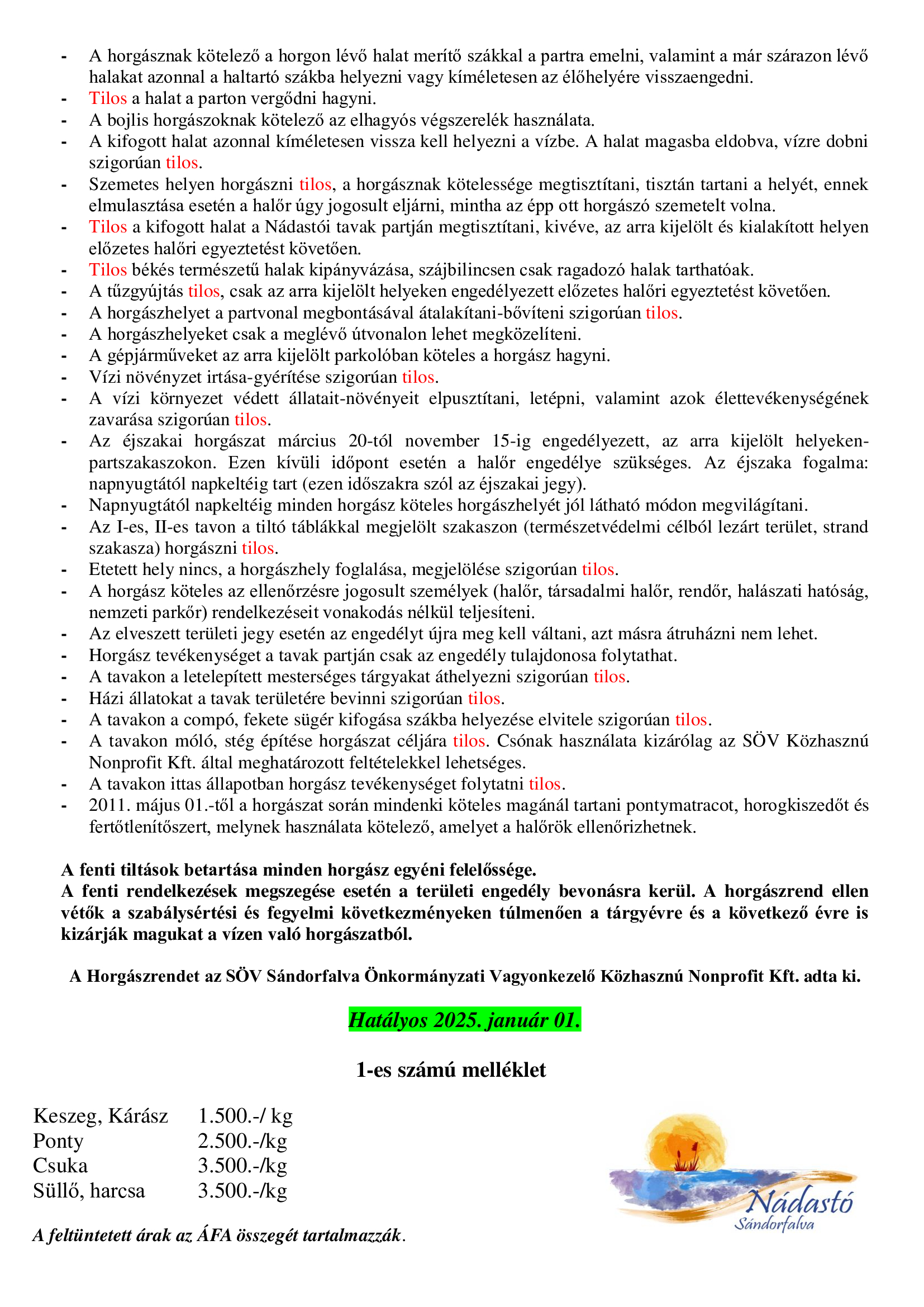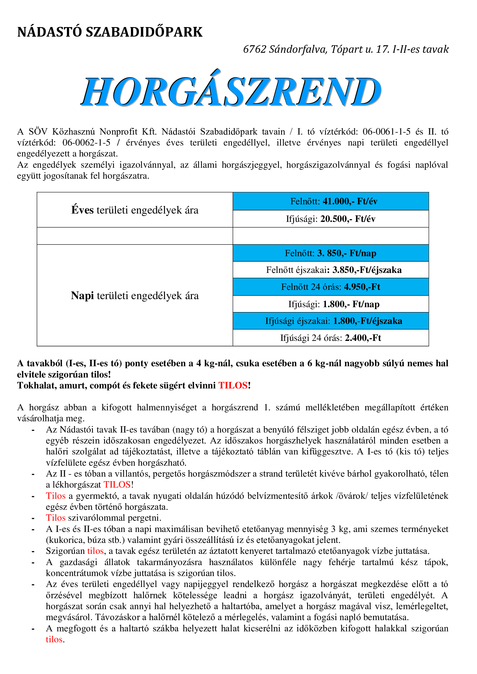 A Nádastó szabadidőpark aktuális árai és horgászrendje: