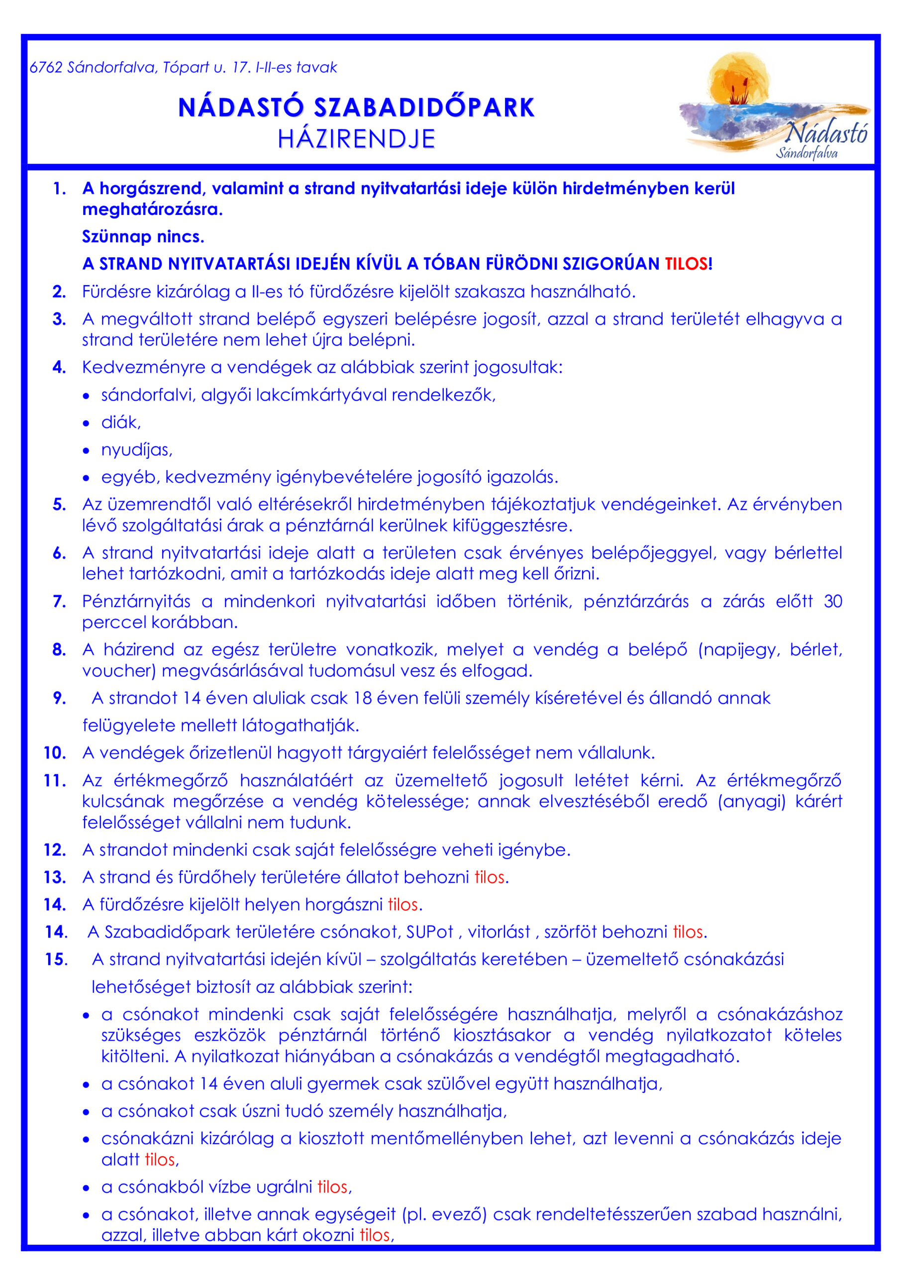6762 Sándorfalva, Tópart u. 17. Nádastó Szabadidőpark 06 20 777 1210