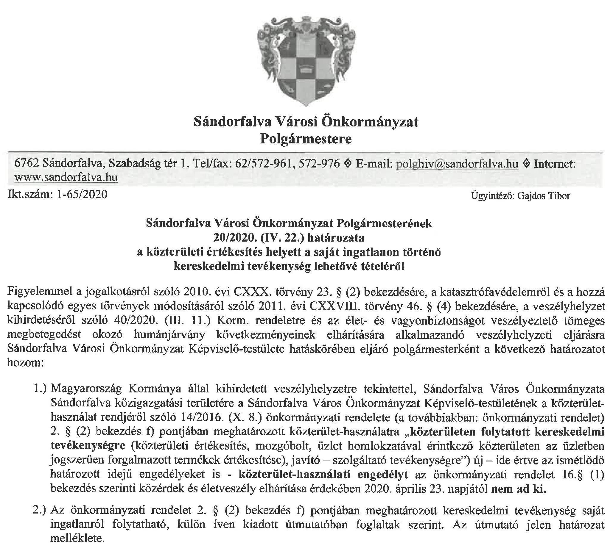 A saját ingatlanon történő árusításról szóló 20/2020. (IV. 22.)-es Polgármesteri határozat részleteit alább olvashatják