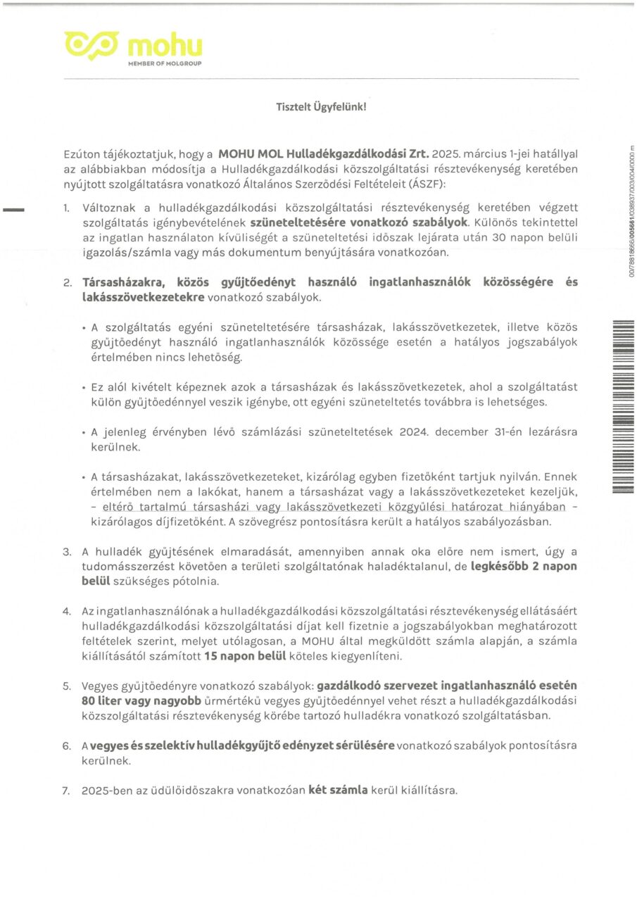 A MOHU MOL Hulladékgazdálkodási Zrt. az alábbi tájékoztatást adta az Általános Szerződési Feltételeik megváltozásával kapcsolatban.
