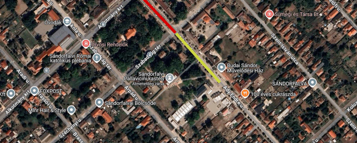 Az MVM Démász Áramhálózati Kft. a közcélú villamos hálózaton előre tervezett munkálatokat fognak végezni, amik miatt június 15-én 16 órától június 16. 17 óráig Sándorfalva központjában a fotón pirossal jelölt útszakasz, tehát a Szabadság tér Önkormányzat előtti, Alkotmány körút és Széchenyi utca közötti szakasza teljesen le lesz zárva. A sárgával jelölt területen Az Ady Endre utcának a Széchenyi utcától kezdődően a Piacig tartóan a Piac oldalában a parkolók le lesznek zárva, de az út szabadon járható lesz.