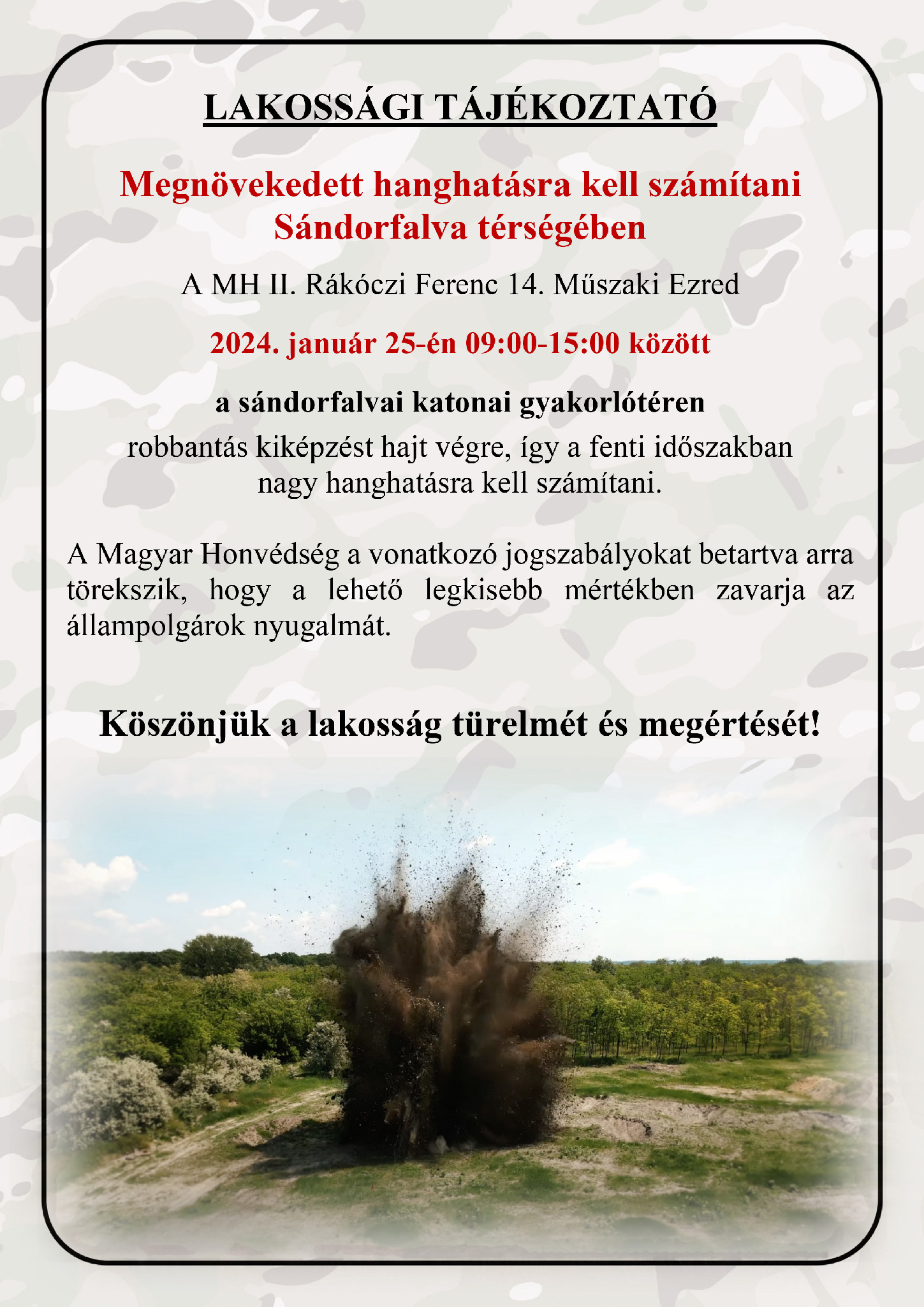 Lakossági tájékoztató a 2024. január 25-i honvédségi gyakorlatról